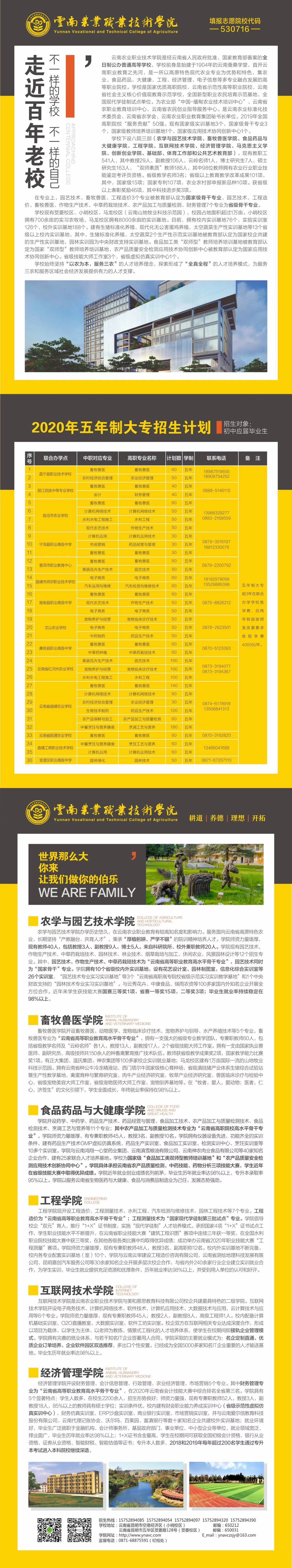 云南农业职业技术学院2020年五年制大专招生计划