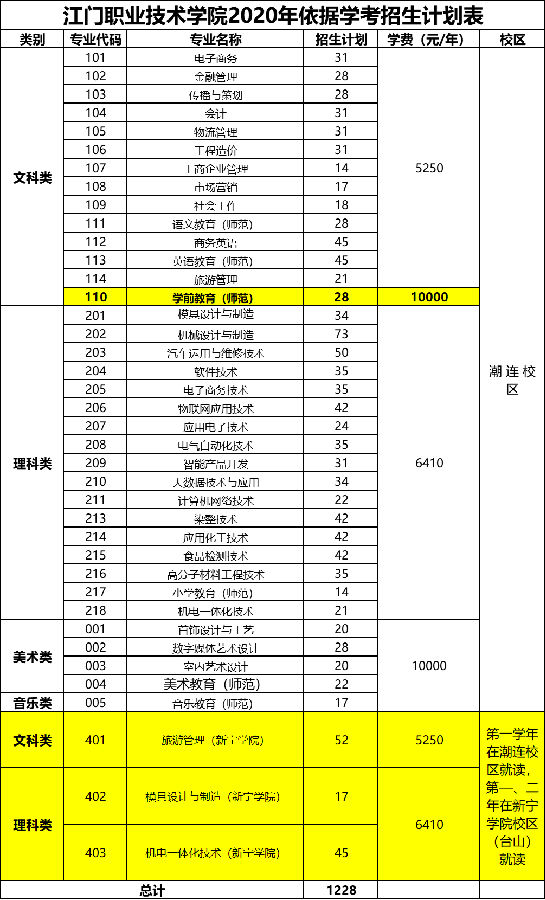 江门职业技术学院2020年学考招生计划