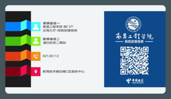 (2)在学生宿舍楼栋的一楼大厅内均贴有“网络故障报修工作牌”,通过微信扫码方式进行报修。网络报修牌如下图所示:
